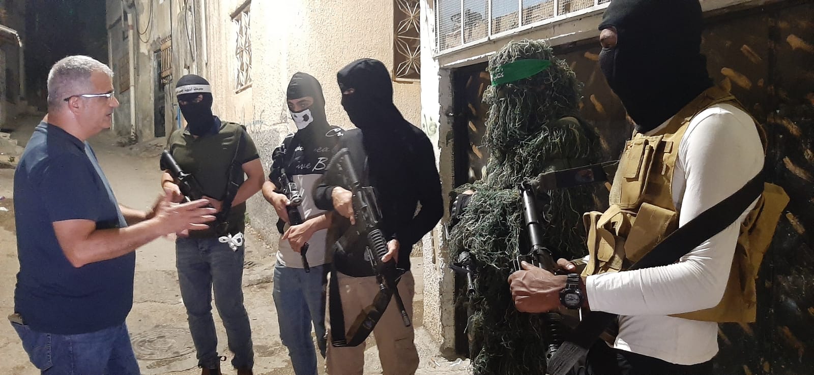 [1]Masked gunmen from different Palestinian factions speak to The Media Line reporter Mohammad Al-Kassim while on patrol at the camp on October 26, 2021. (Noor Khatib/The Media Line)