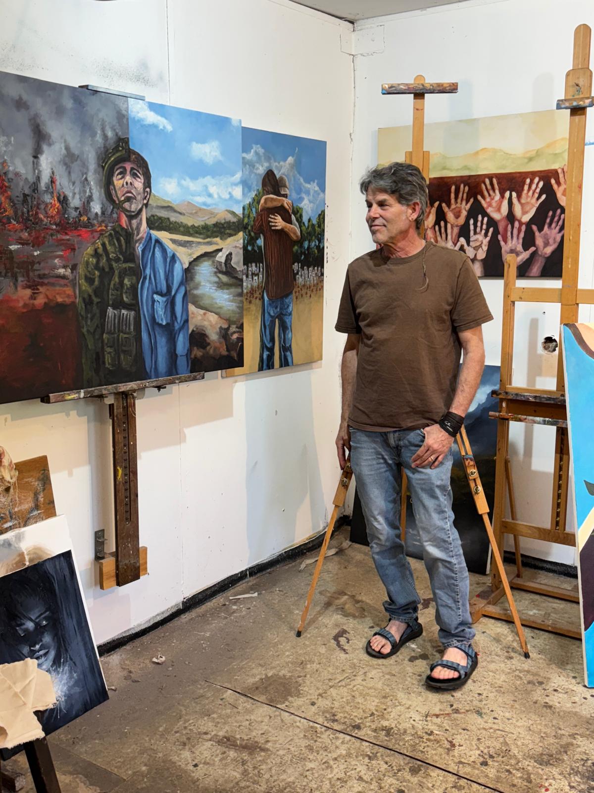 On the left side of the oversized canvas, an ash-gray sky bleeds into the burning reds and oranges of fire. The right side glows with hues of blue skies, desert sand, rolling hills, and water. And in the middle stands a figure, half soldier and half civilian. His right arm is wrapped in an army uniform, and a helmet rests on half his head, while his left arm wears a blue civilian jacket.