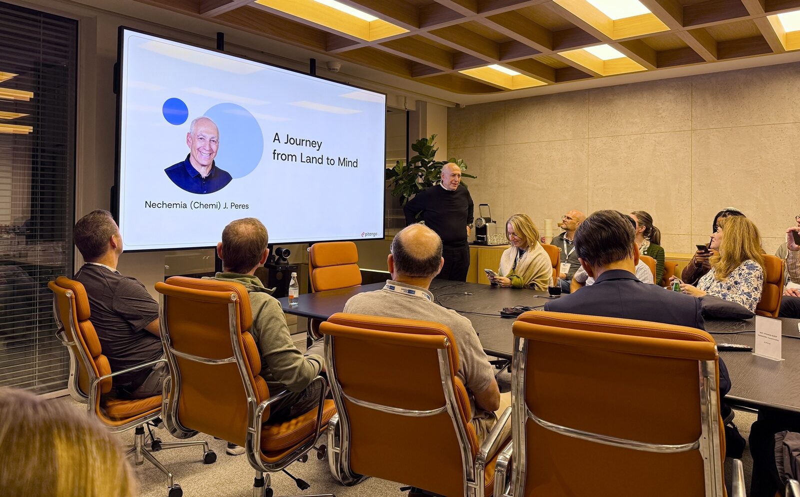 Chemi Peres, co-founder and managing general partner of Pitango Venture Capital, speaks to the delegation at Pitango’s office in Tel Aviv. (Courtesy Israel Tech Mission)