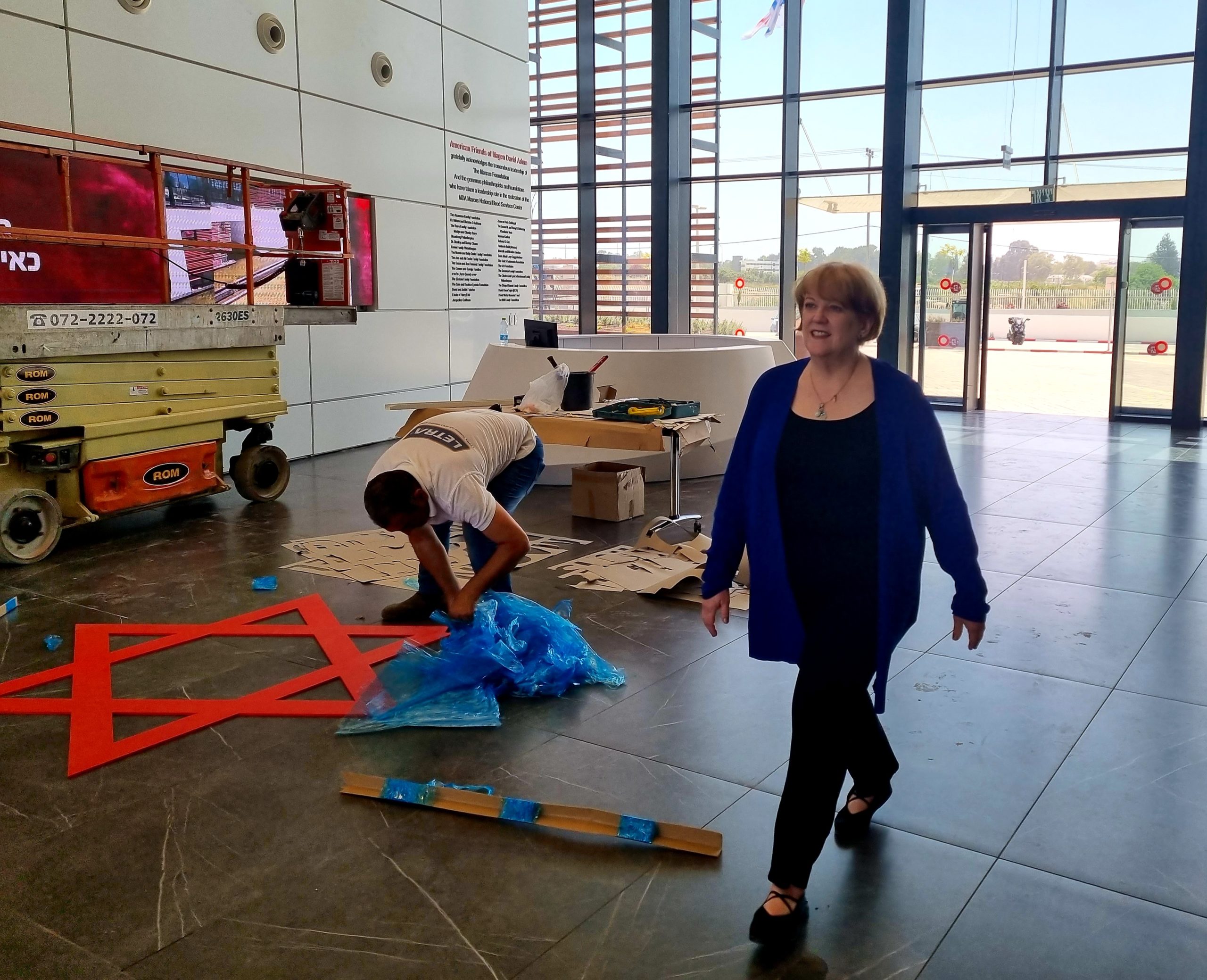 Catherine Reed, CEO of American Friends of Magen David Adom, walks past workers putting the finishing touches on the new Marcus National Blood Services Center. (Maya Margit/The Media Line)
