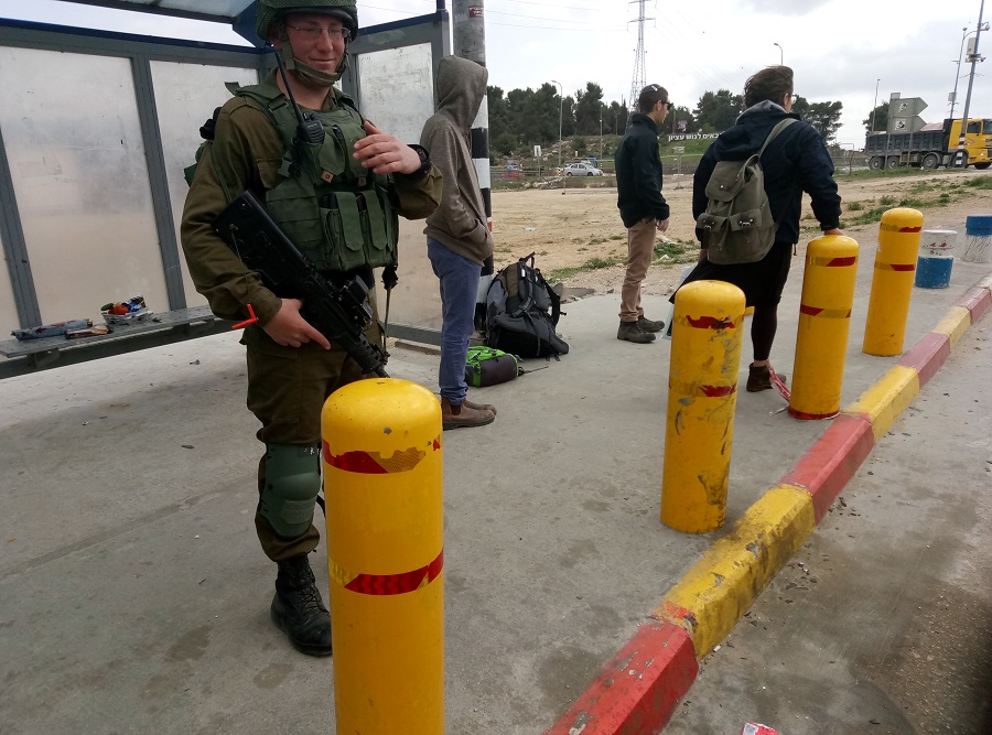 The Gush Etzion junction boasts a new mall, as well as a large supermarket with Jewish and Palestinian employees. The nearby bus stop has been the site of a series of Palestinian attacks. Just last week, a young Palestinian woman, 16, tried to ram her car into soldiers guarding the bus stop. She did not succeed because of heavy yellow barriers placed recently in front of the bus stop. Soldiers shot and wounded her. Small metal pieces are still scattered in front of the bus stop.