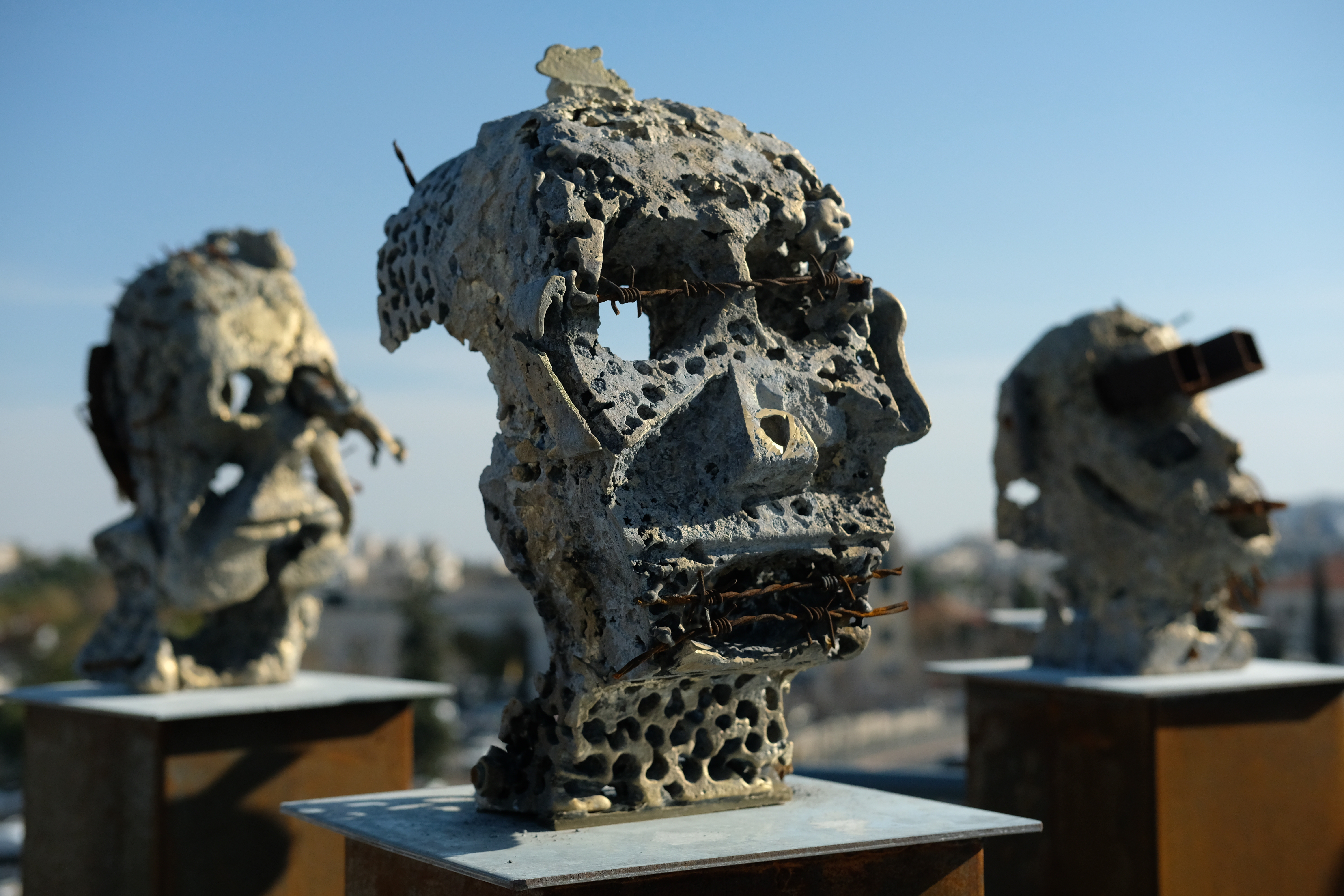 The ghoulish heads stand on the rooftop of a building and peer down at the street below that marks the dividing line between east and west Jerusalem. They are part of a recently unveiled exhibition at the Museum on the Seam – Israel’s only political museum – called “Gall and Wormwood.”