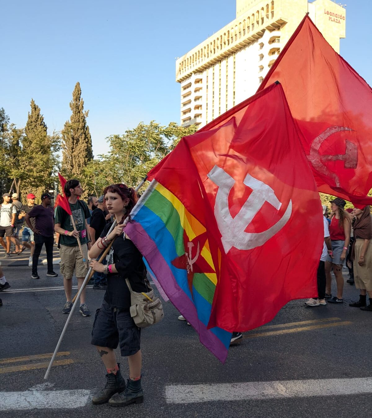 A participant carries a rainbow LGBTQ flag merged with communist symbolism, including the hammer and sickle, alongside red flags of the same iconography—reflecting the intersection of queer identity and anti-capitalist political protest, at the Jerusalem Pride Parade, June 5, 2025. (Addie J. Davis/The Media Line)