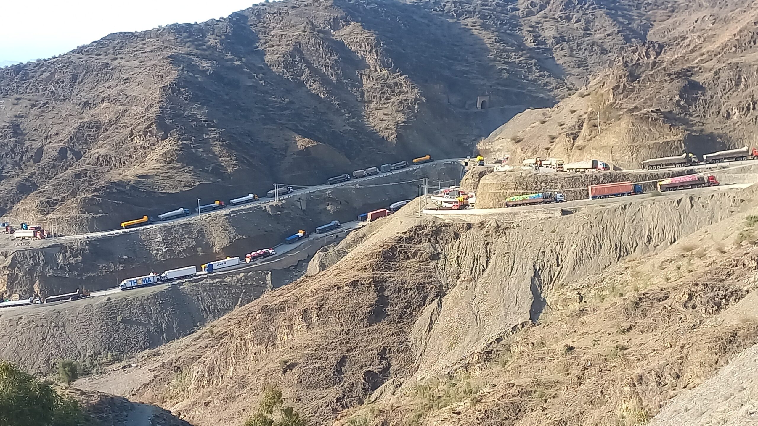 A convoy of heavy trucks navigates the rugged Khyber Pass en route to the Pakistan-Afghan border at Torkham. (Courtesy Hijrat Ali Afridi)