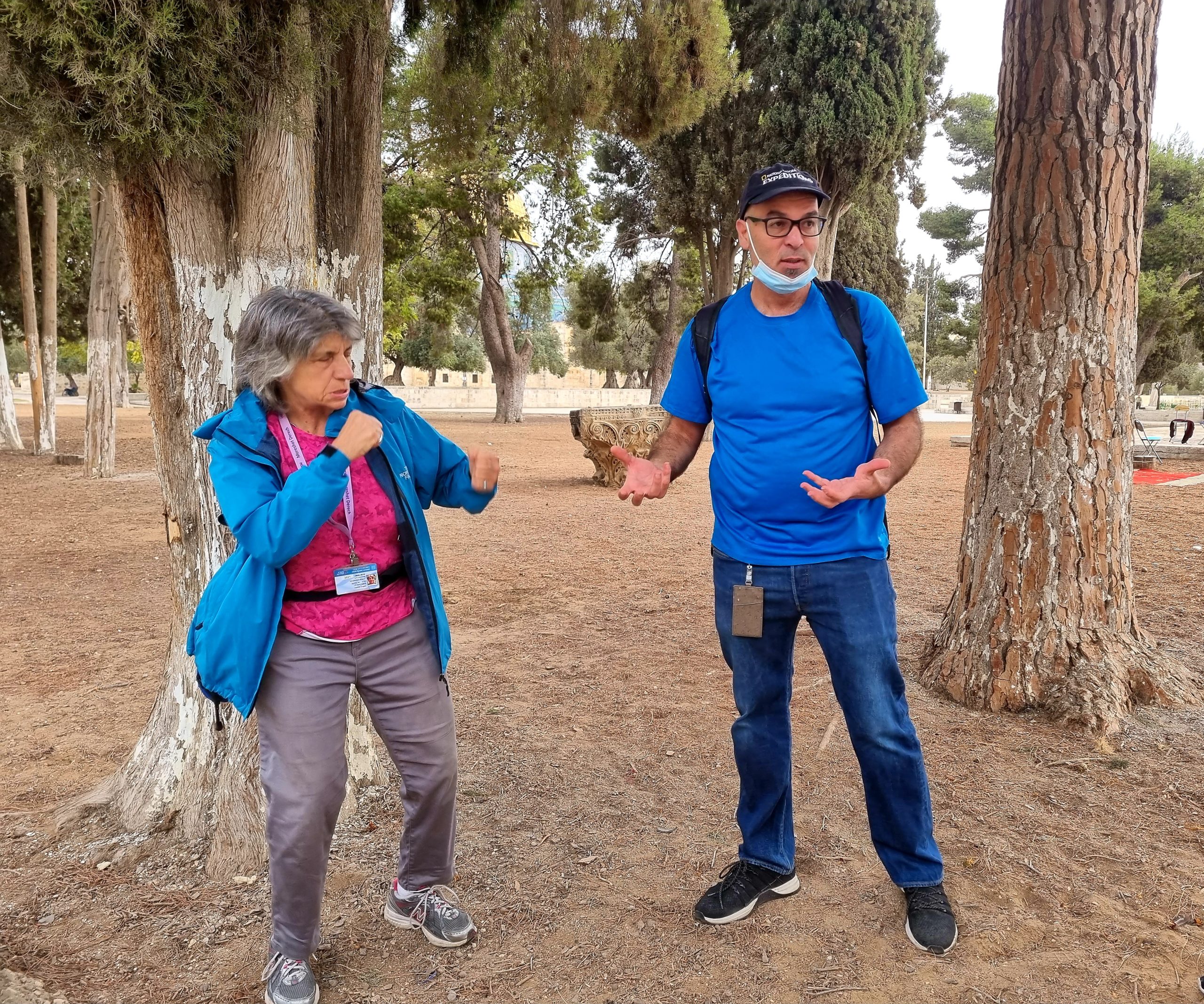 [5]Tour guides Sharon “Morgie” Morgenstern and Husam Jubran offer competing narratives at the start of the Arbraham Tours’ Dual Narrative Tour. (Maya Margit/The Media Line)