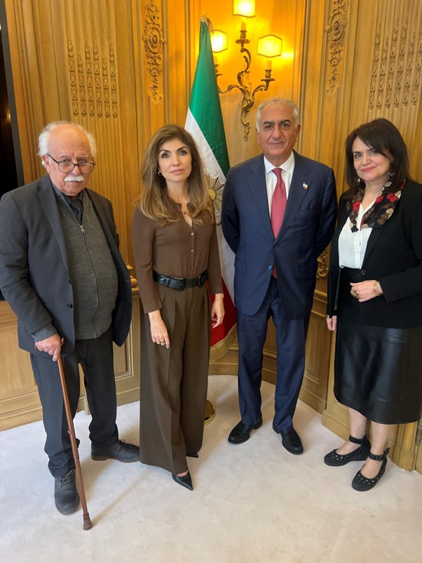 Crown Prince Reza Pahlavi (C-R) and his wife Princess Yasmine Pahlavi’s (C-L) meeting with Iranian leftist intellectuals Dariush Ashoori (L) and Chahla Chafiq (R) in Paris drew widespread criticism. However, they say they are seeking coordinated action and unity among right, left, and centrist forces against the Islamic Republic. (X/Reza Pahlavi Communications)
