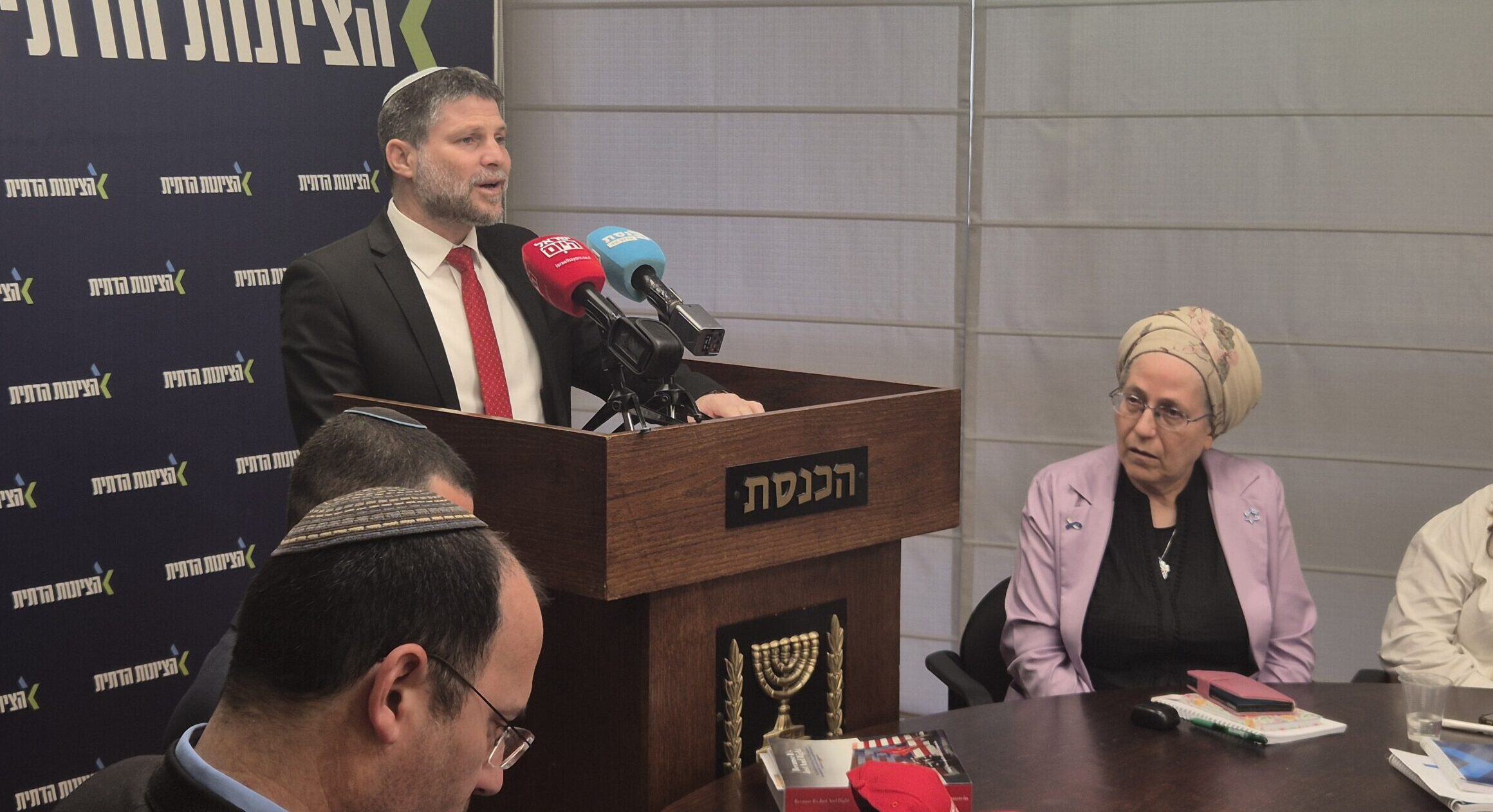 Bezal;el Smotrich at a meeting of the Religious Zionism faction in the Knesset, Jerusalem, Oct. 27, 2025. (Gabriel Colodro/The Media Line)