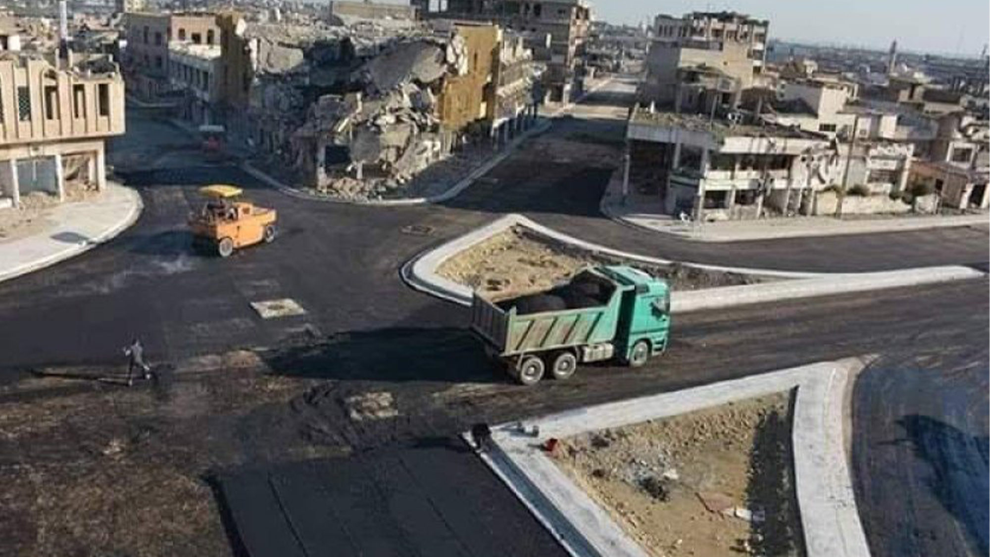 Reconstruction in the city of Mosul, with buildings destroyed by the war with ISIS seen in the background. January 2023. (Municipality of Mosul)