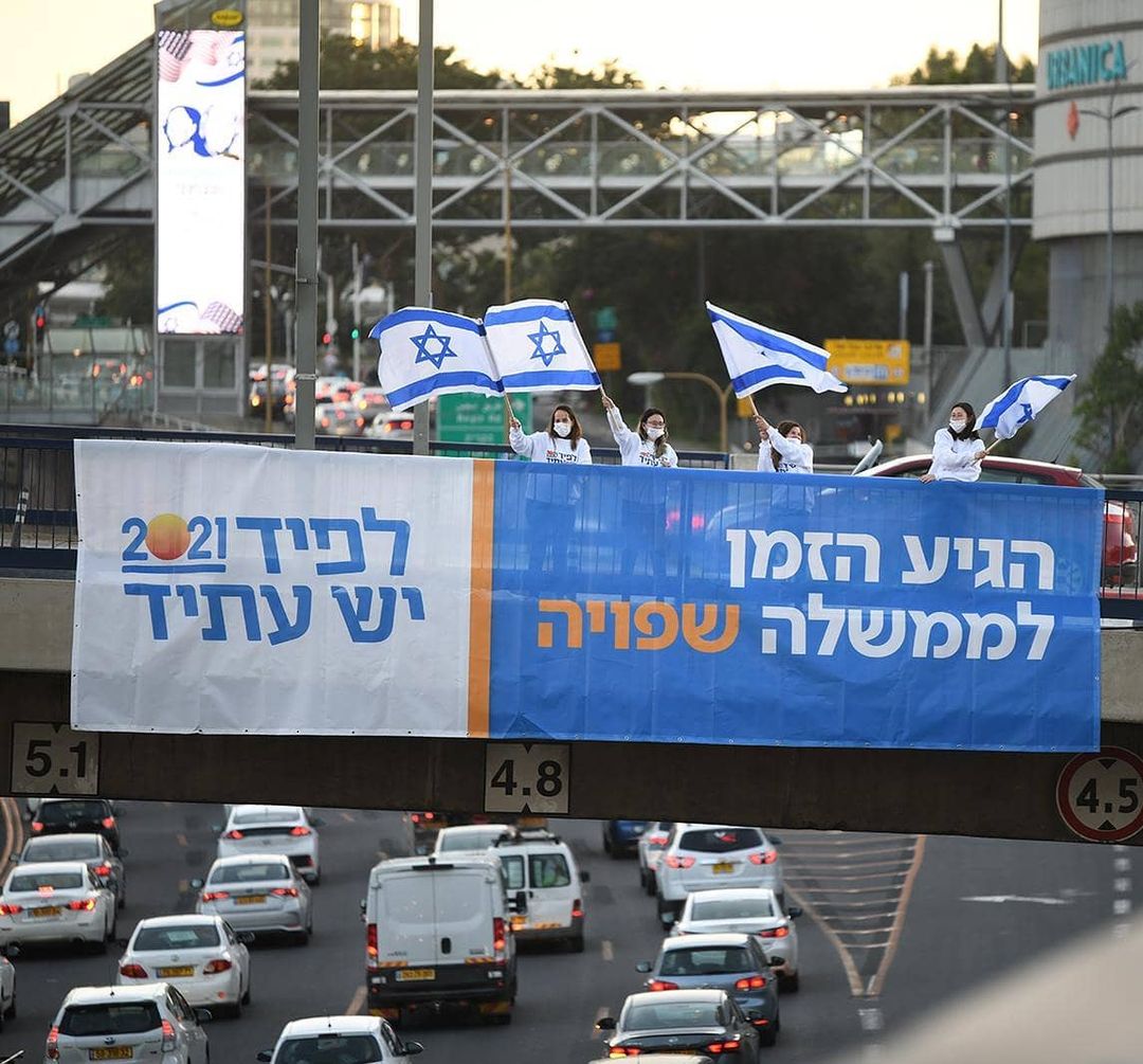 [3]Supporters rally over a Yesh Atid campaign poster in Tel Aviv. The slogan on the poster reads: ‘The time has come for a sane government.’ (Instagram/Yair Lapid)