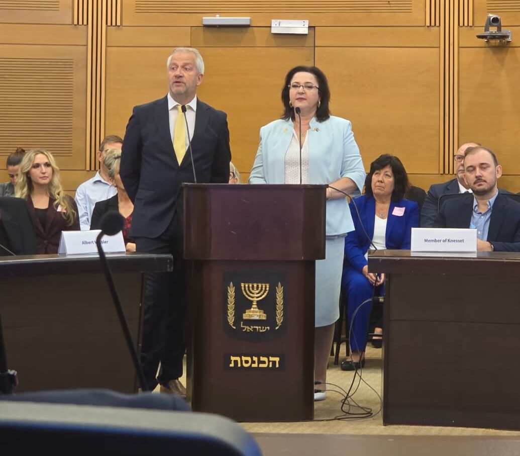 Albert Veksler, global director and co-founder of the Jerusalem Prayer Breakfast, and MK Tatiana Mazarsky, at the Knesset Day of Prayer, Nov. 26, 2025 in Jerusalem. (Felice Friedson/The Media Line)